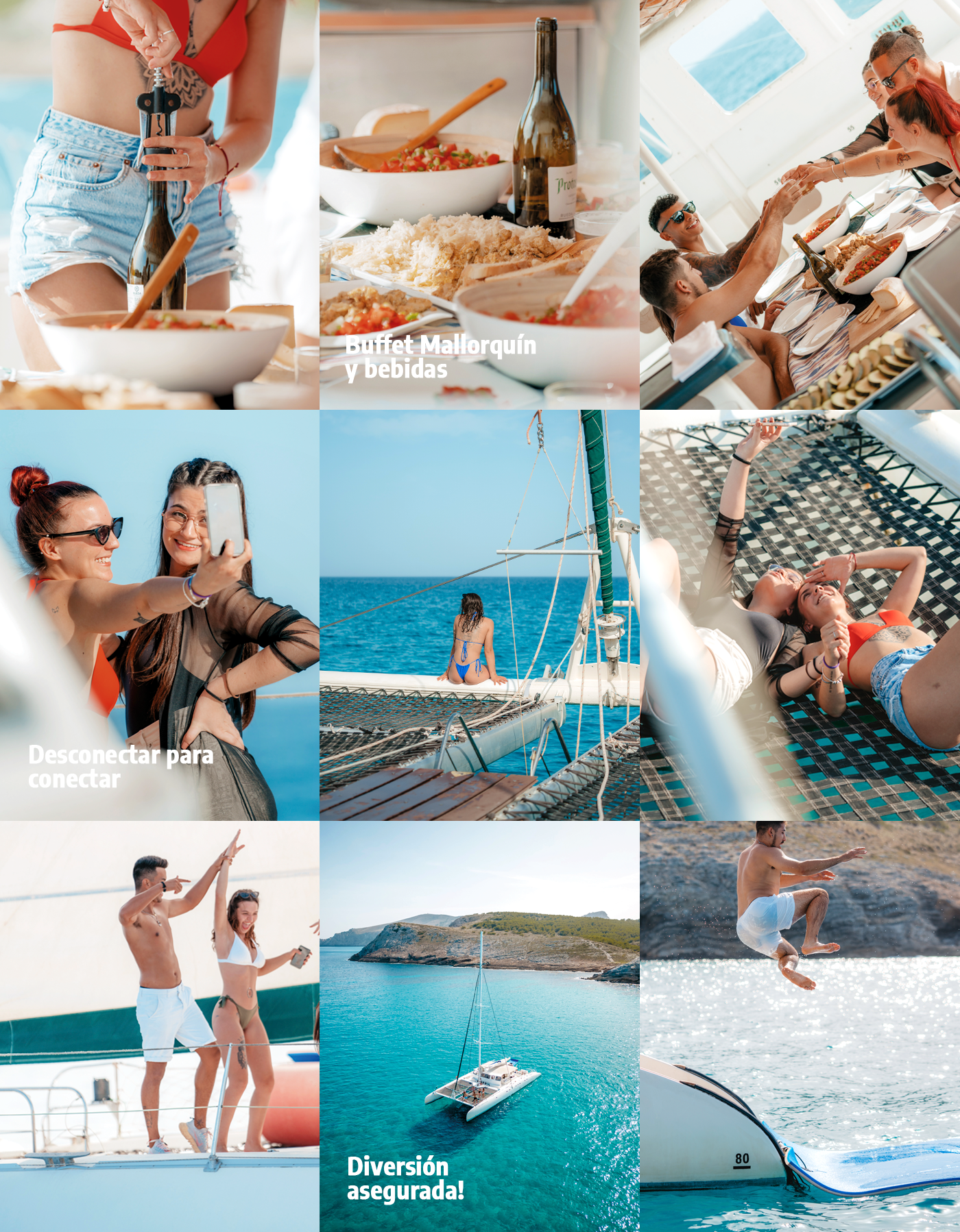 Comenzamos en el puerto de Cala Ratjada, la dirección del catamarán a vela esta determinada por el viento. Además de nuestra tripulación, hay un DJ a bordo que cumple con todos vuestros deseos musicales. Abrimos el bar a bordo nada más salir del puerto con una amplia selección de bebidas: cerveza, vino espumoso, tinto de verano y bebidas no alcohólicas como refrescos y agua. Durante una extensa parada en medio de un maravilloso entorno mediterraneo, puede nadar, relajarse y disfrutar del agua cristalina o simplemente relajarse en las redes del catamarán. La tripulación te sorprenderá con un buffet mallorquín compuesto por: